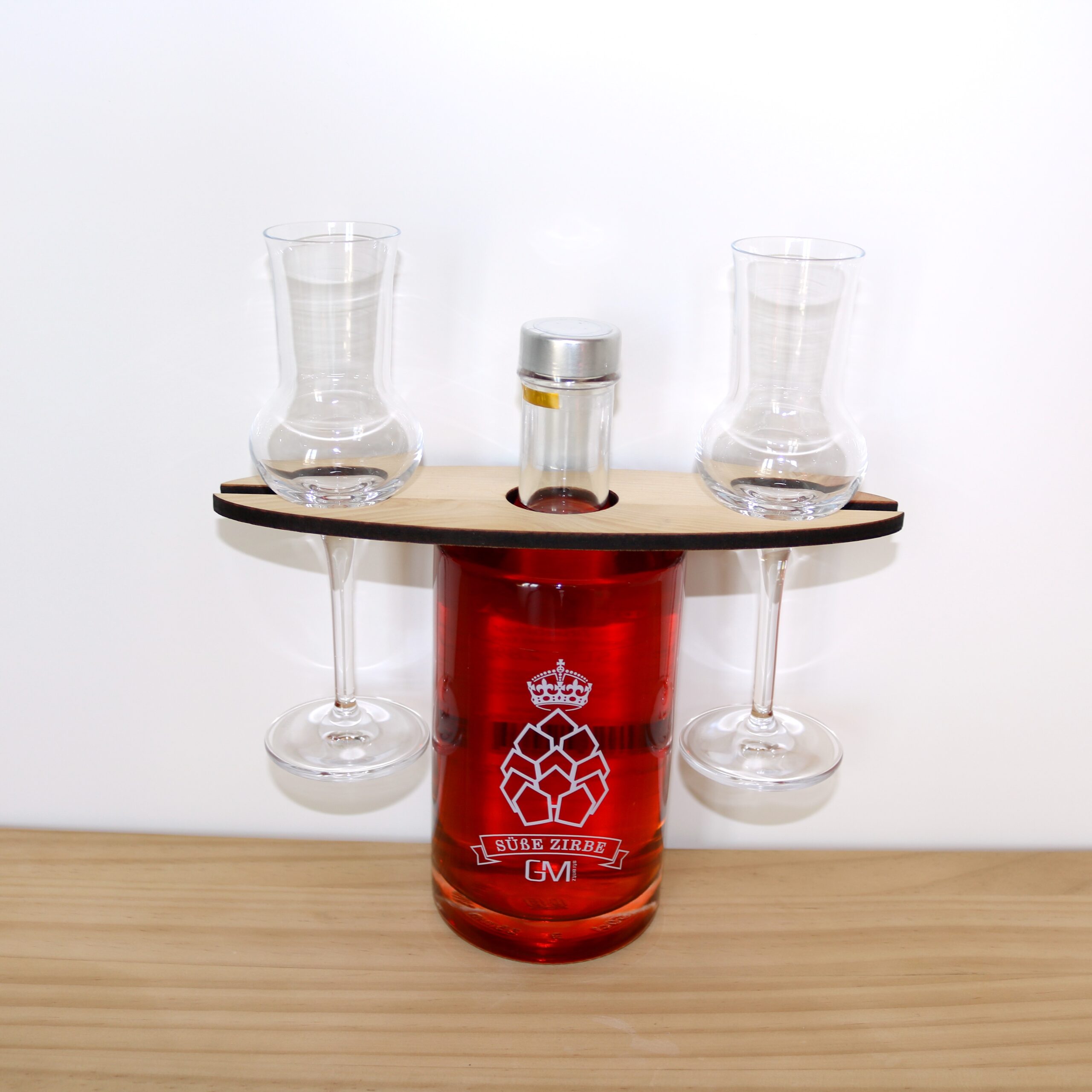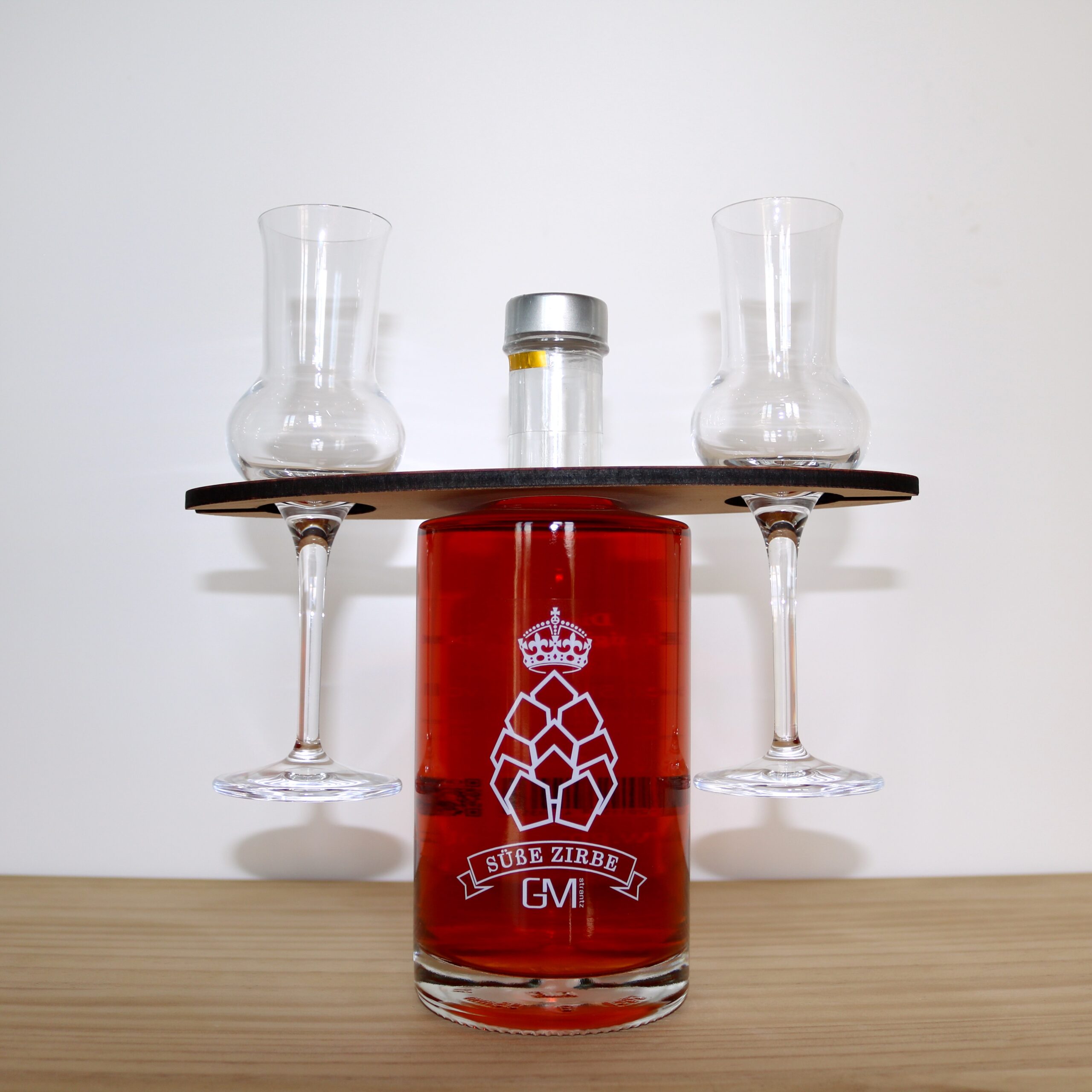 Der Set enthält 0.5 l Flasche süssen Zirbenlikör und 2 schöne Likörgläser der Marke Stölzle in einem Halter aus Arvenholz.